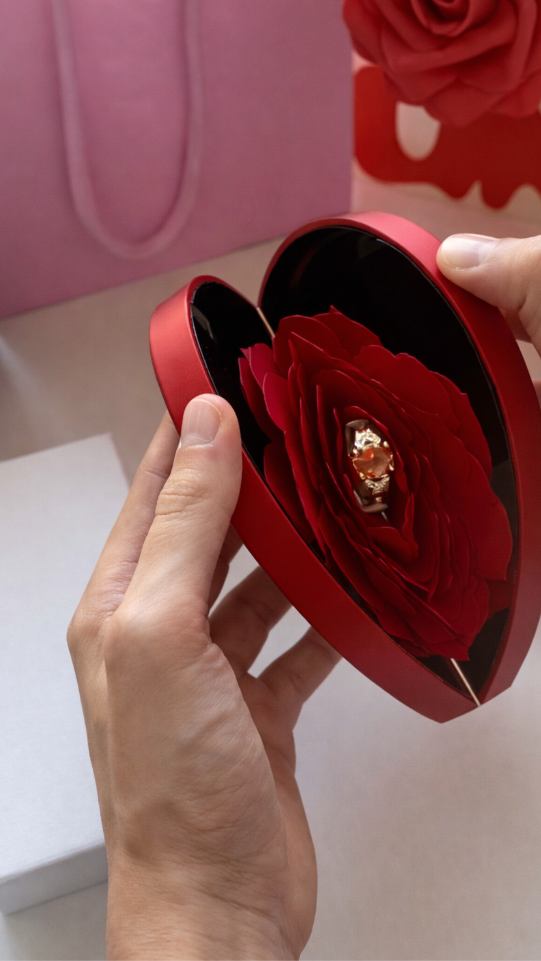 Este elegante joyero con forma de corazón esconde en su interior una delicada rosa que guarda un anillo ajustable, creando un efecto sorpresa inolvidable al abrirlo.